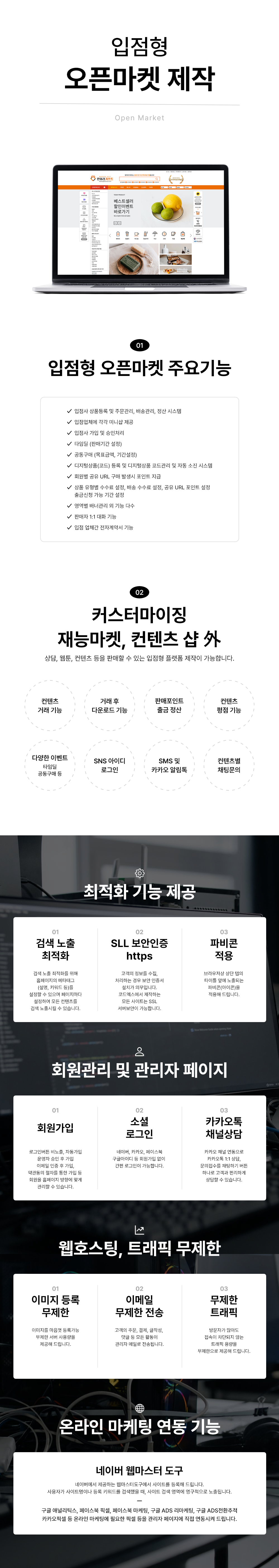 입점사 상품등록, 주문&배송관리, 정산기능 등 다양한 기능을 탑재하여 커스터마이징 재능마켓, 컨텐츠샵 외 다양한 분야의 입점형 플랫폼 제작서비스